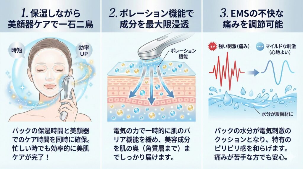 ブライトエレキブラシの「パックの上からの使用」には、単なる時短以上の美容メリットが3つあります。