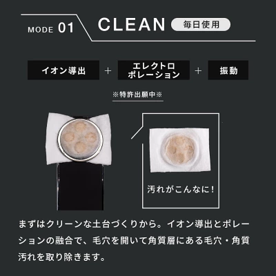 CLEANモードは洗顔だけでは落としきれない毛穴の奥の汚れや古い角質を、イオンの力で吸着するのが目的。